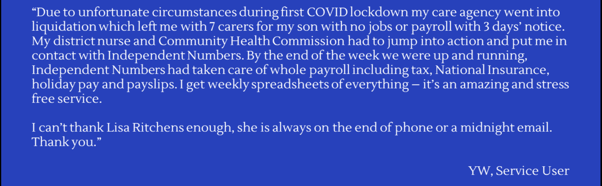 There are some customers whose support needs go above and beyond running payroll. Lisa has experience of home visits to support customers with paperwork, banking and understanding processes around PHBs. Whatever your requirements, we are happy to talk to you give you the help you need.